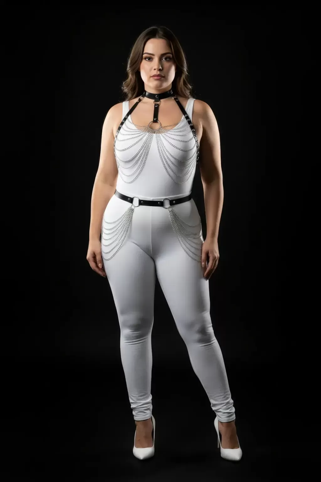 Büyük Beden Siyah Kadın Harness Takım Zincir Detaylı Deri Fantezi Aksesuarı - APFT701