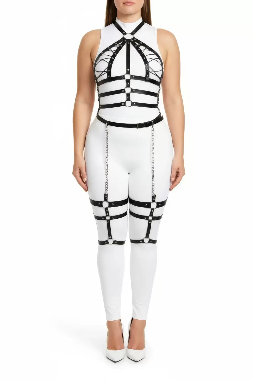 Büyük Beden Siyah Kadın Harness Takım Zincir Detaylı Full Body Deri Aksesuar - APFT698