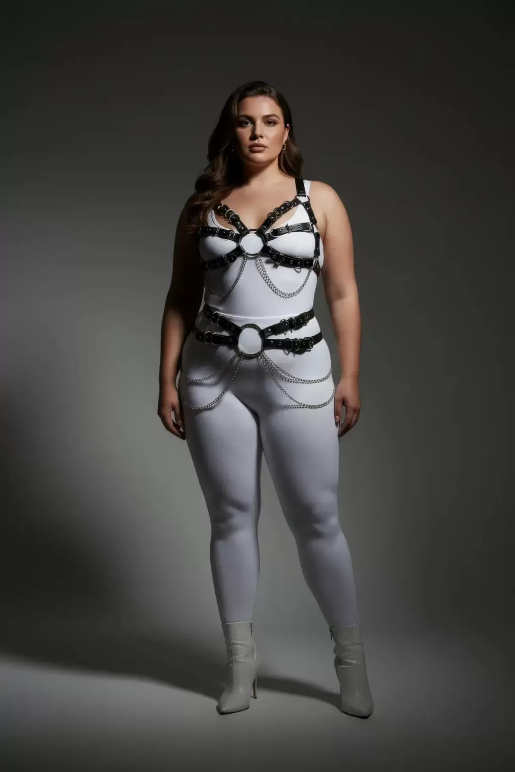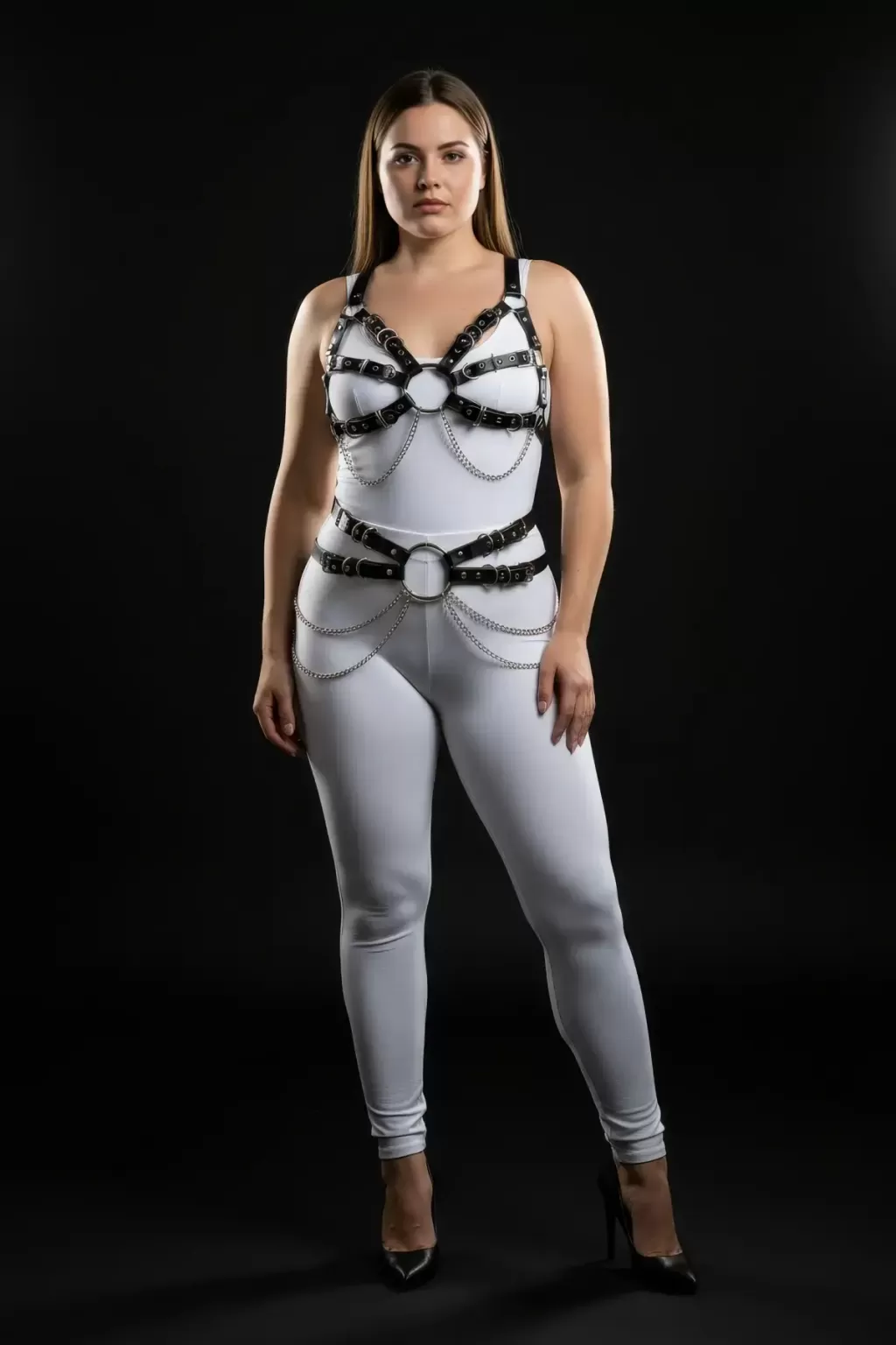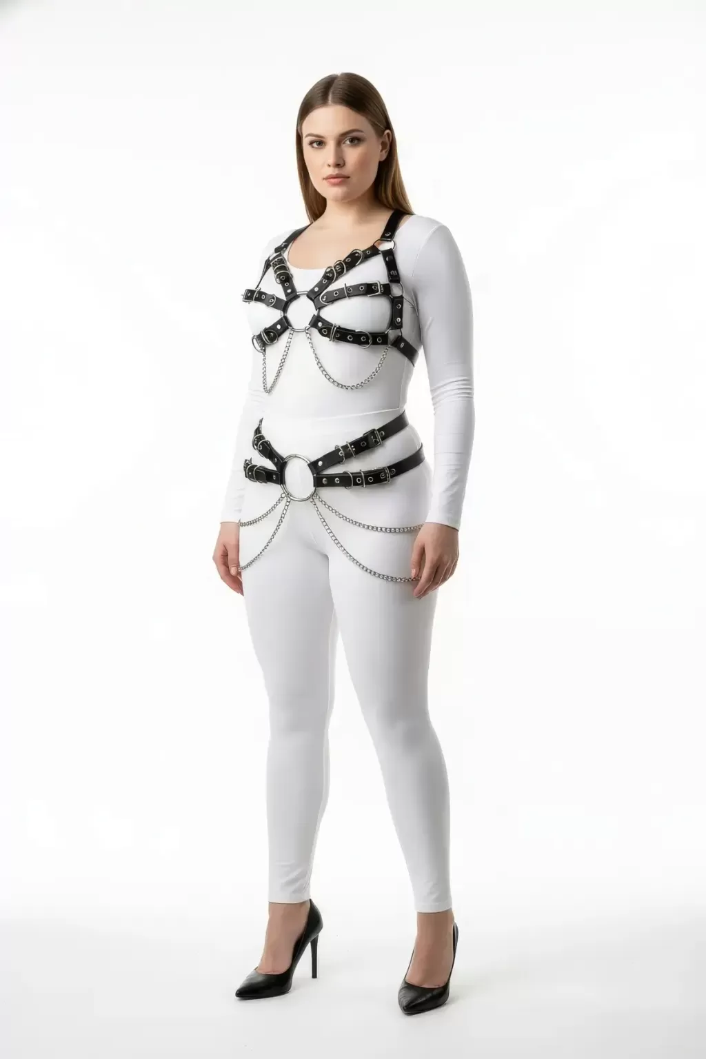 Büyük Beden Siyah Kadın Harness Takım Zincir ve Halka Detaylı Fantezi Aksesuarı - APFT1260