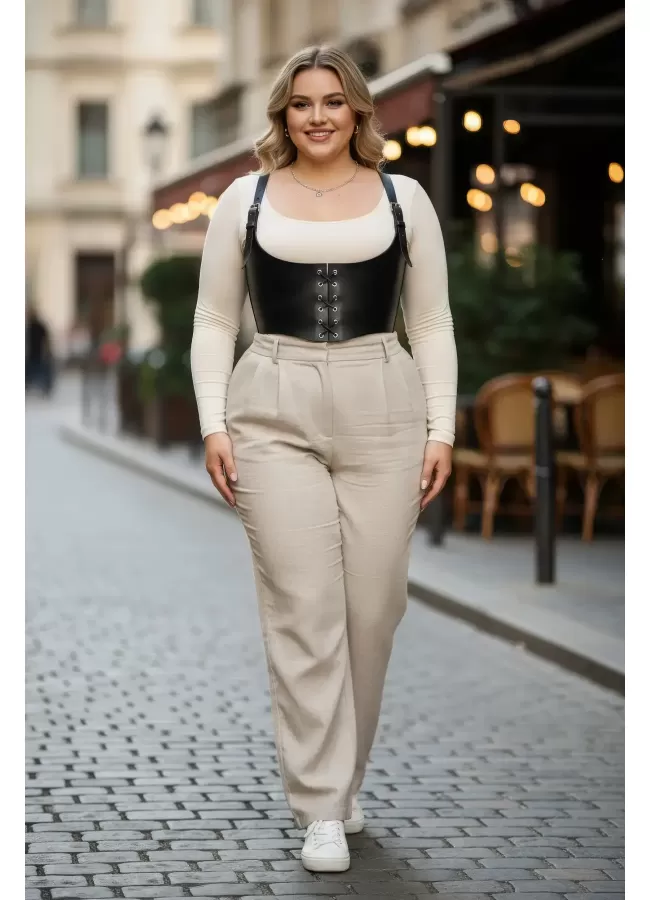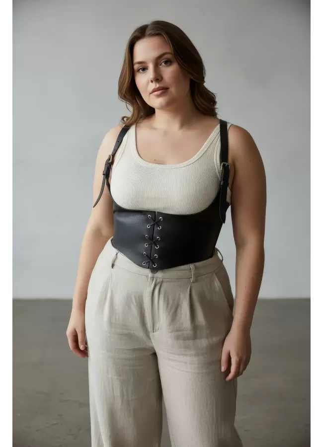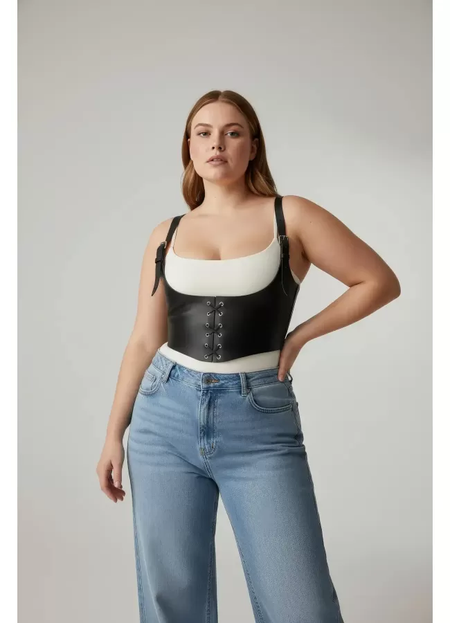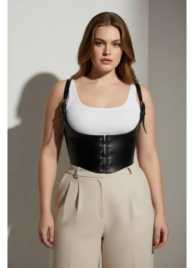 Büyük Beden Siyah Kadın Kemer Bağcıklı Korse Detaylı Deri Görünümlü - APFT1428