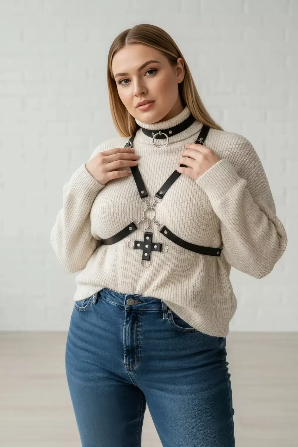 Büyük Beden Siyah Kadın Kemer Choker Yaka Haç Detaylı Deri Harness - APFT404