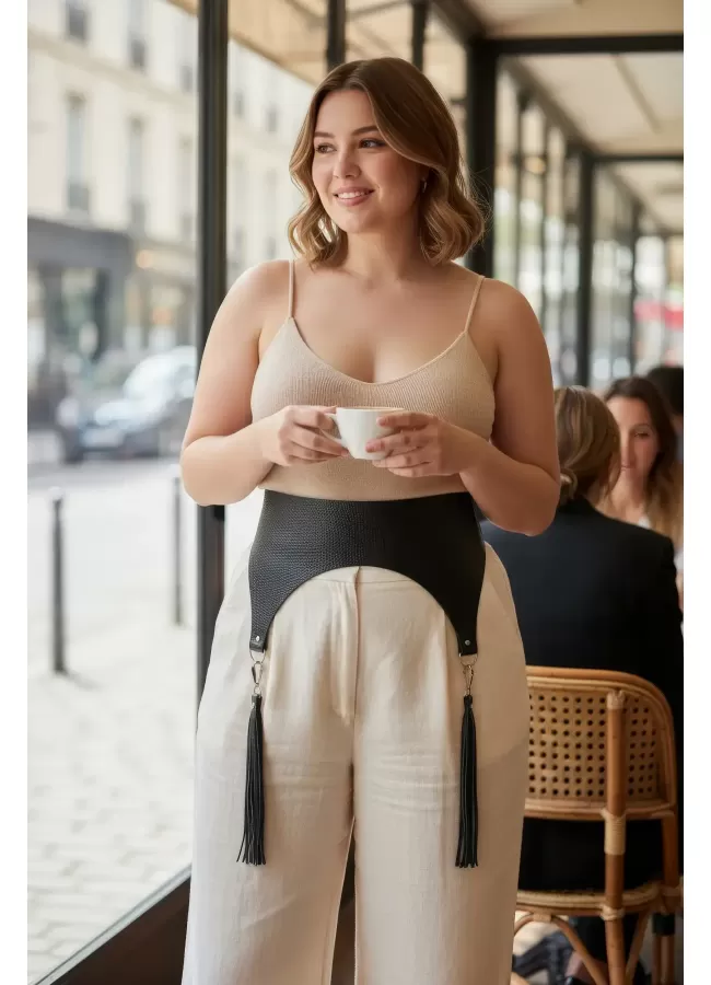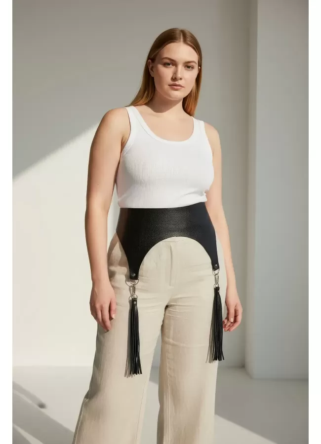 Büyük Beden Siyah Kadın Deri Kemer Omuz Askılı Bağcıklı Korse - APFT1429