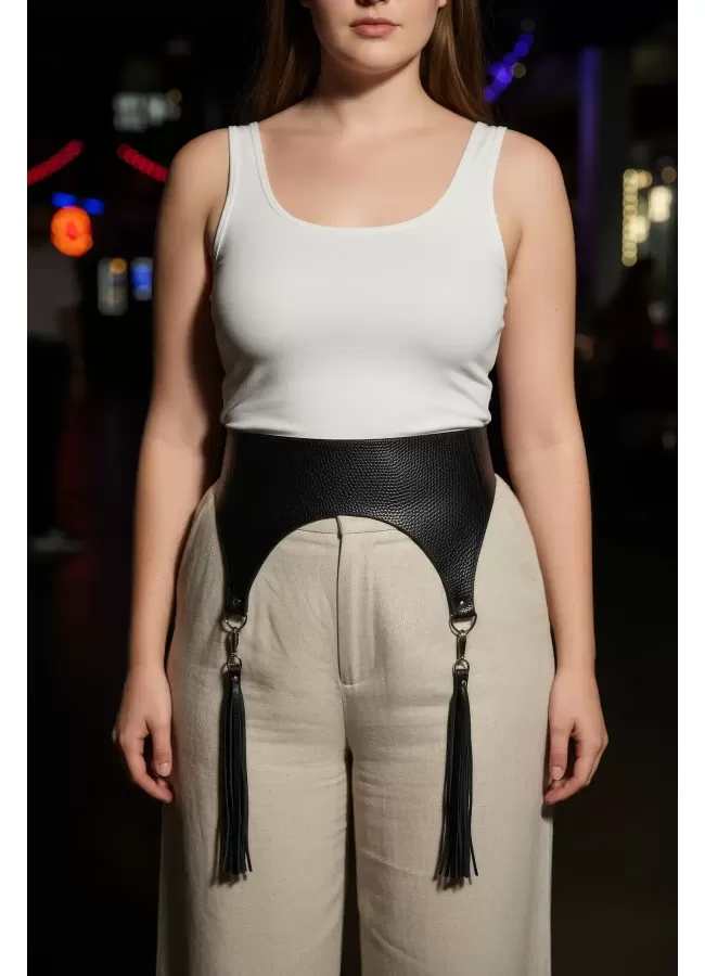 Siyah Kadın Kemer Omuz Detaylı Çift Tokalı Vücut Aksesuarı - APFT1113