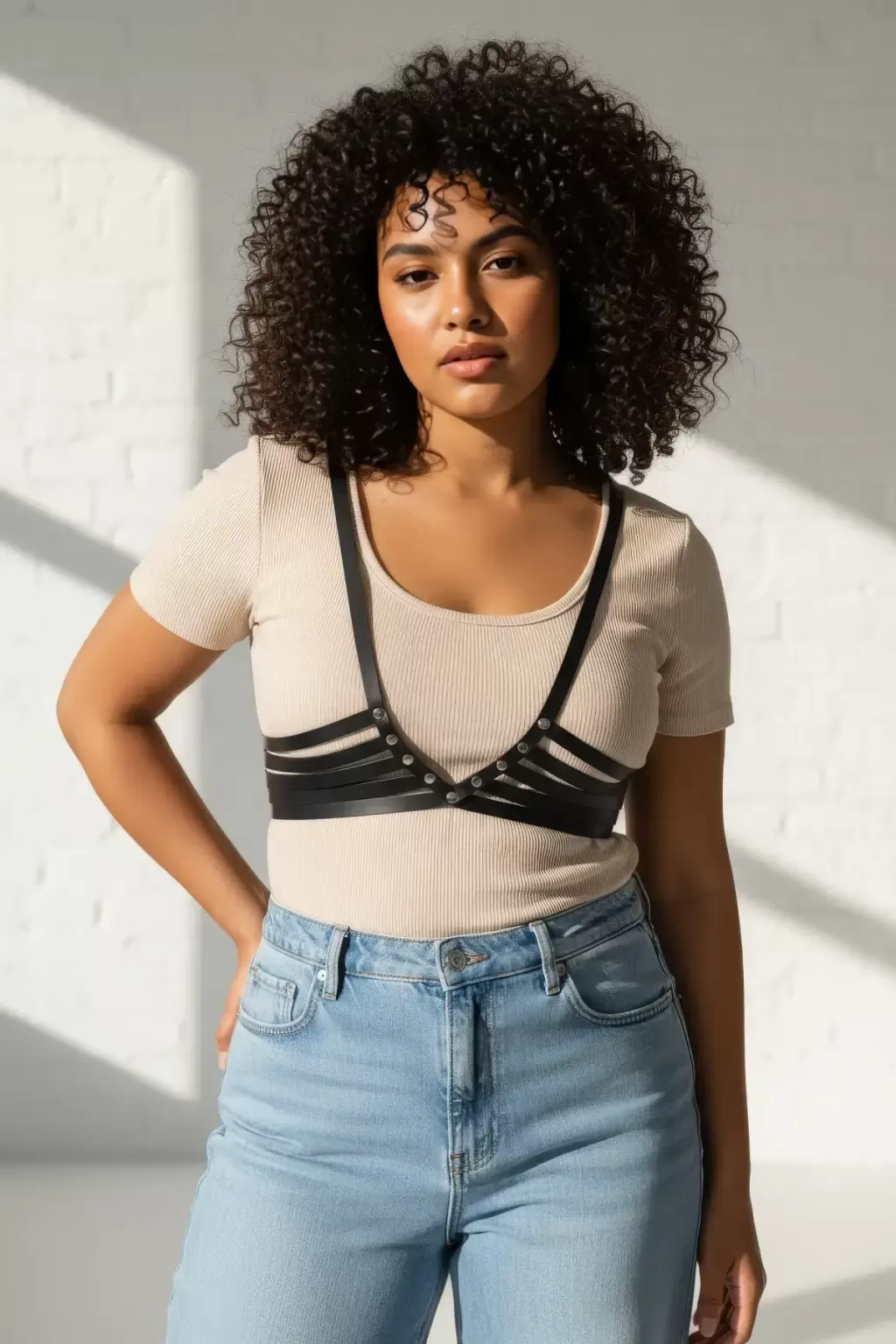 Büyük Beden Siyah Kadın Kemer Harness Stili Korse Görünümlü Deri Vücut Aksesuarı - APFT199
