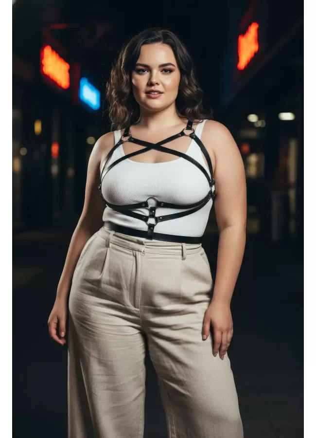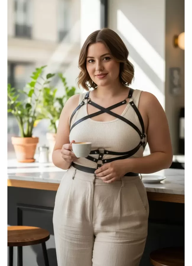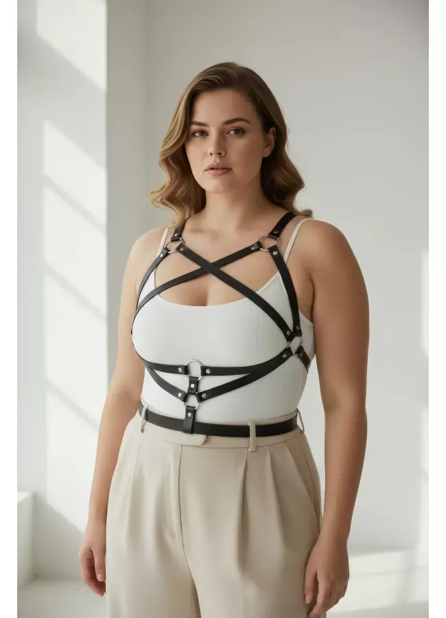 Büyük Beden Siyah Kadın Kemer Harness Tarzı Deri Vücut Aksesuarı - APFT991