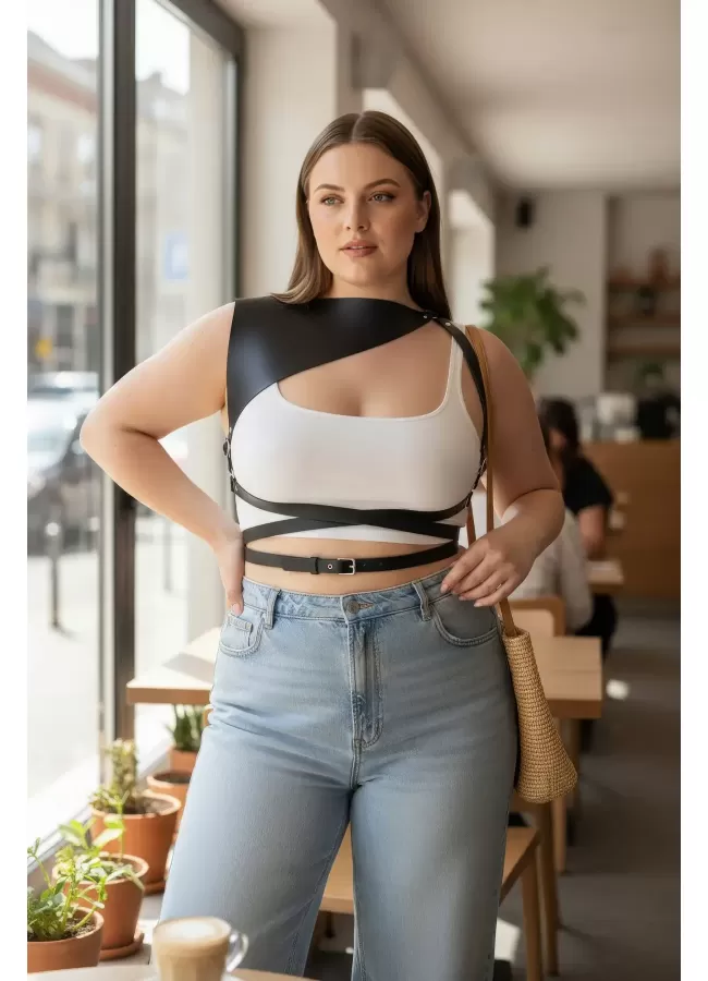 Büyük Beden Siyah Kadın Deri Kemer Omuz Askılı Bağcıklı Korse - APFT1429