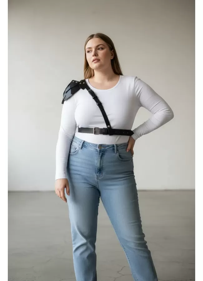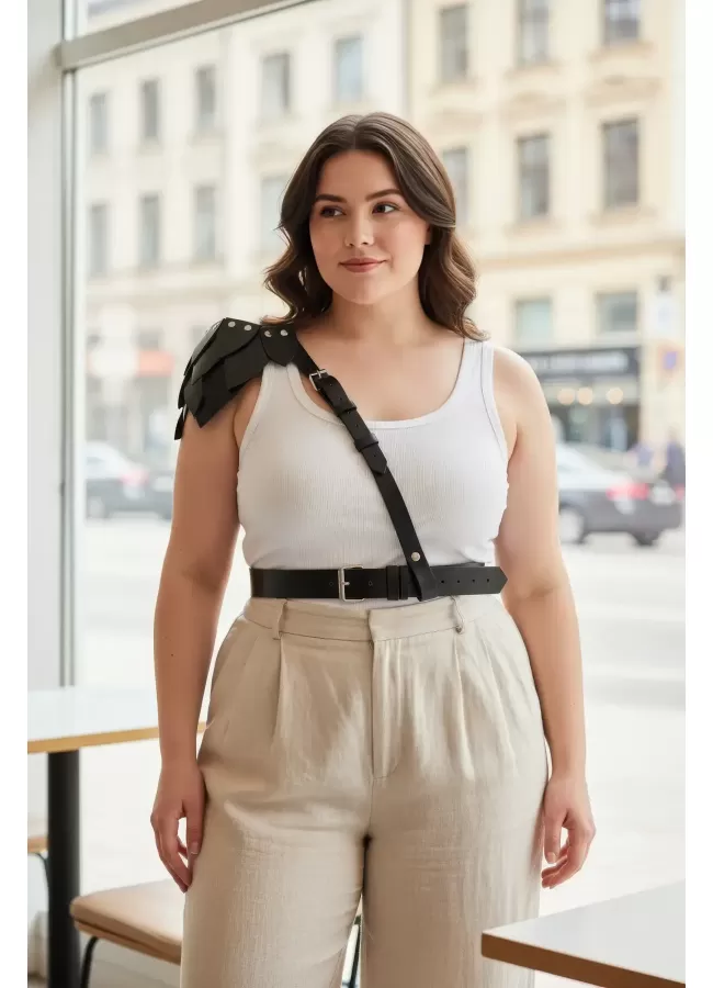 Büyük Beden Siyah Kadın Kemer, Omuz Harness Detaylı Hakiki Deri Kombin Aksesuarı - APFT1033