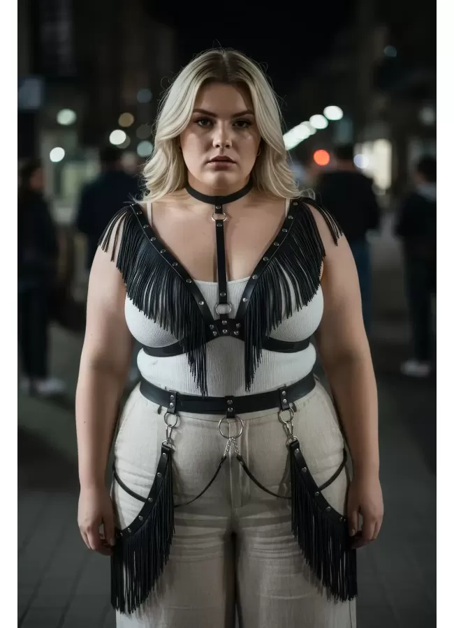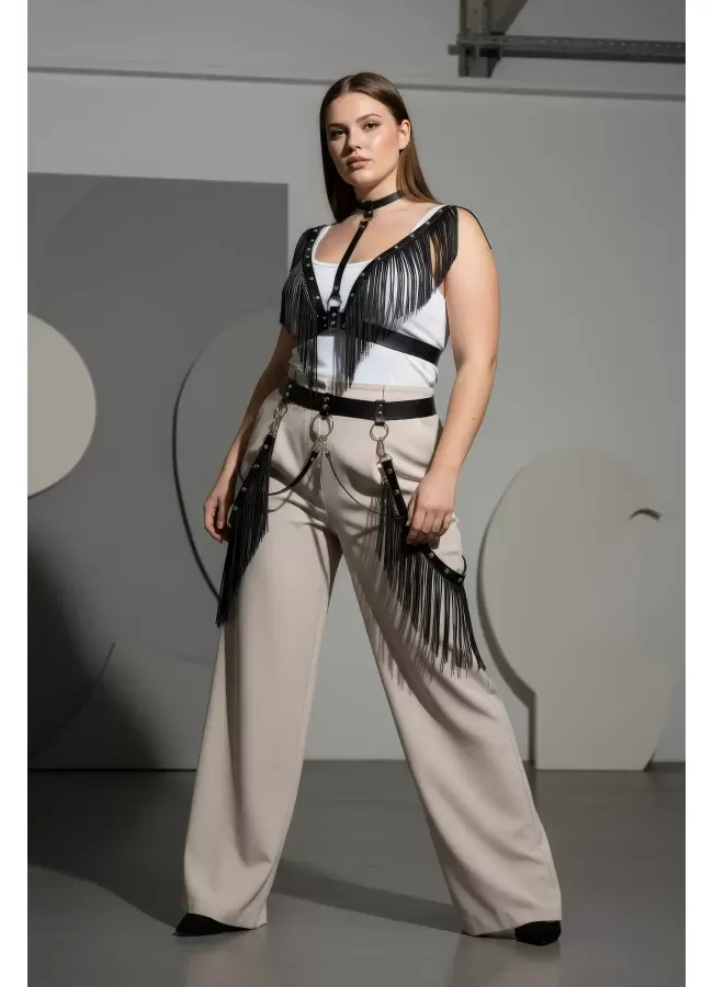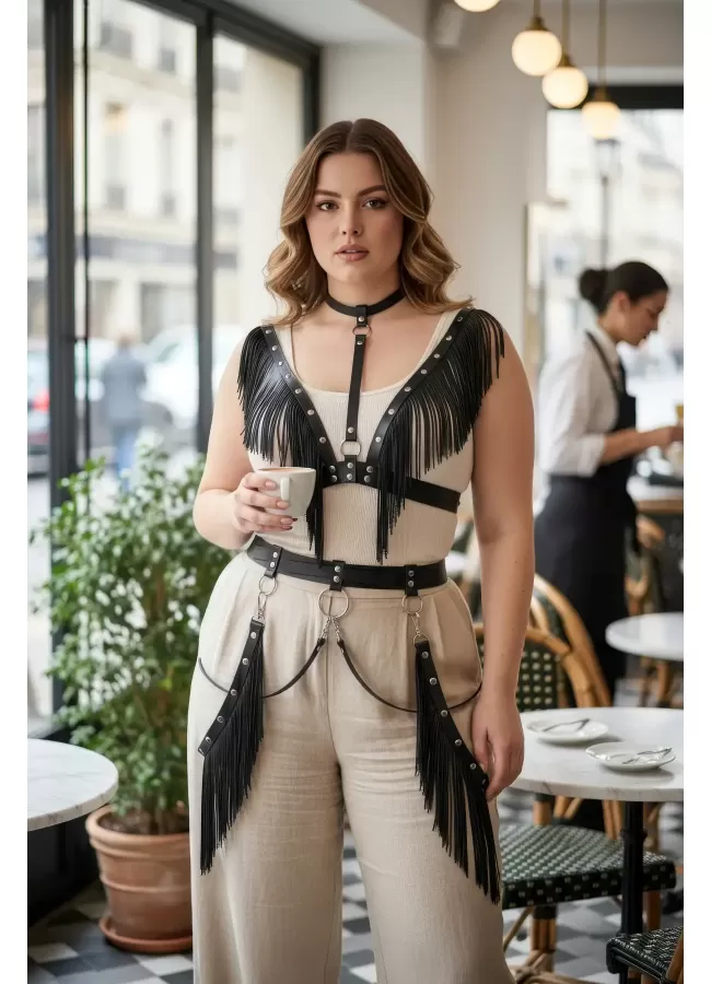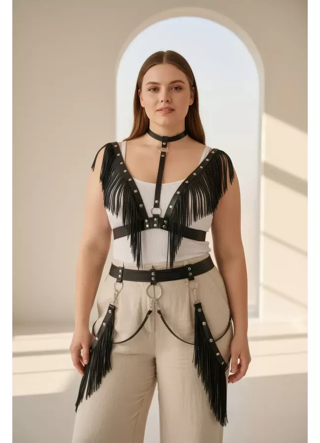 Büyük Beden Siyah Kadın Kemer Püsküllü Deri Harness Vücut Aksesuarı - APFT768