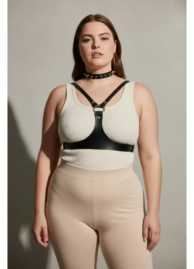 Büyük Beden Siyah Kadın Deri Kemer Omuz Askılı Bağcıklı Korse - APFT1429