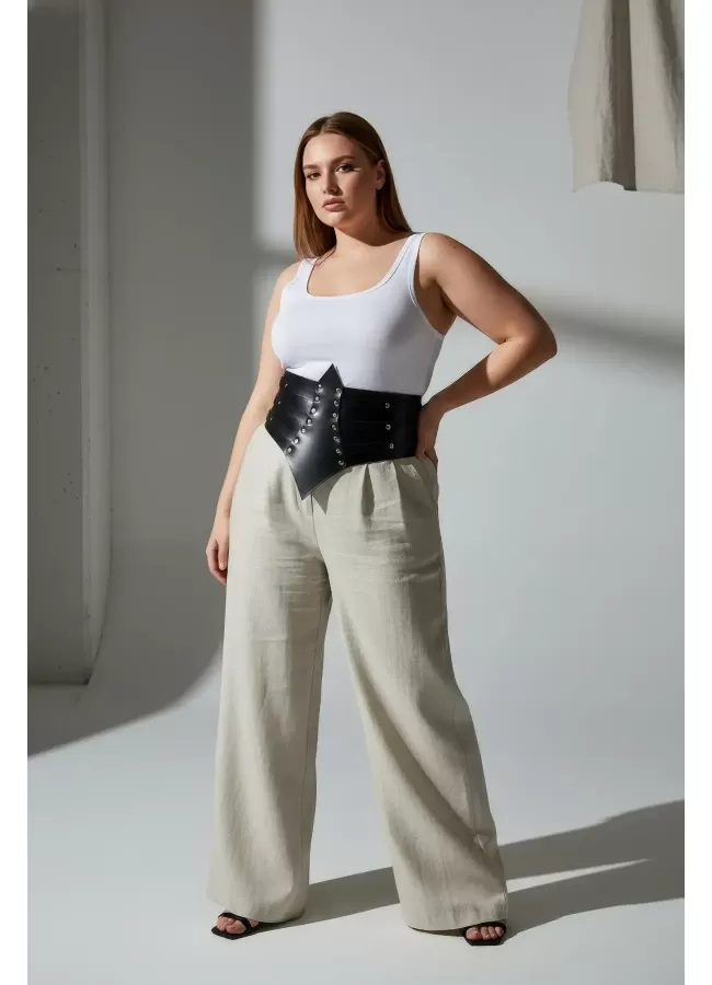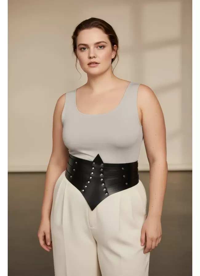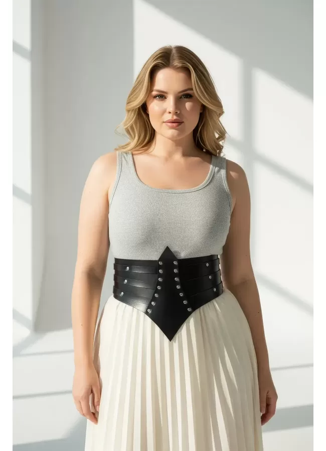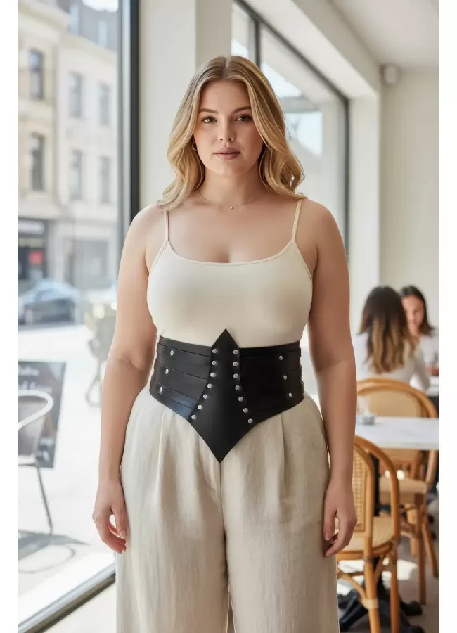 Büyük Beden Siyah Kadın Kemer Zımba Detaylı Geniş Korsaj Tasarım - APFT1087