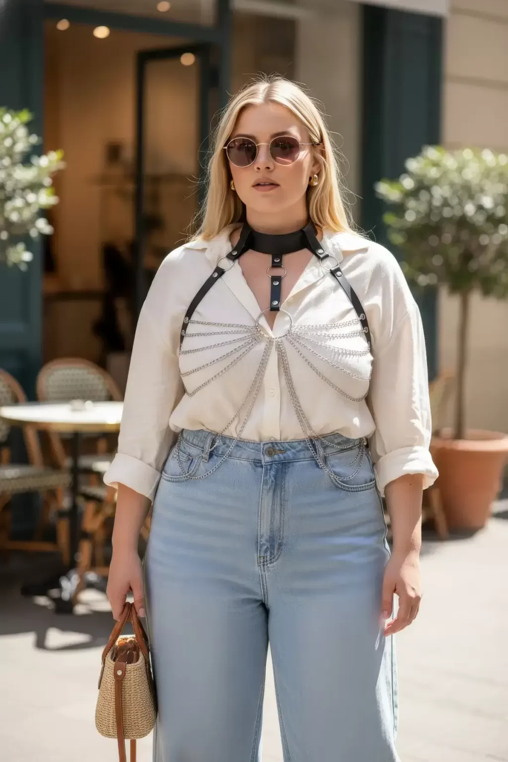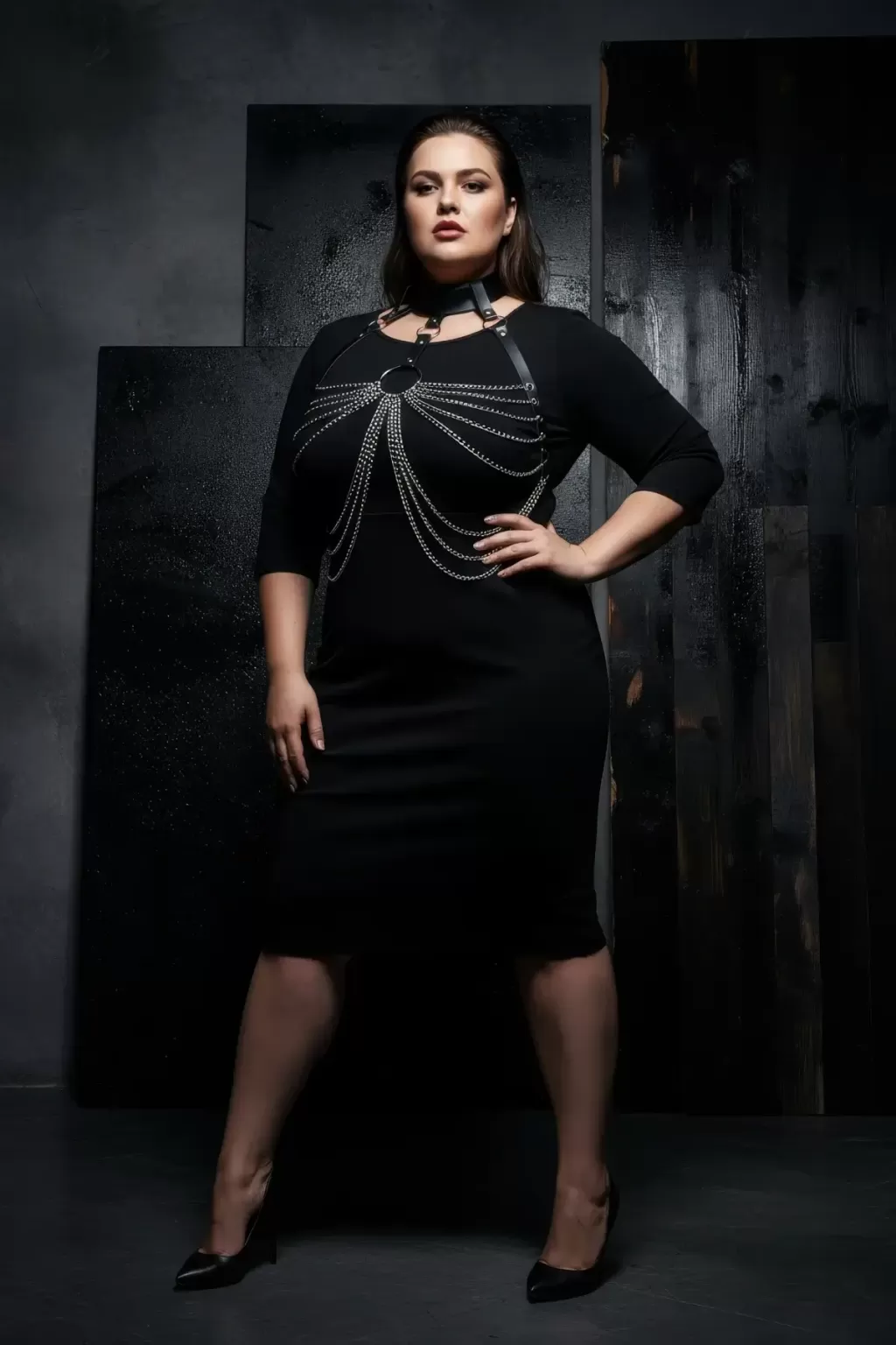 Büyük Beden Siyah Kadın Kemer Zincir Detaylı Deri Vücut Aksesuarı - APFT463