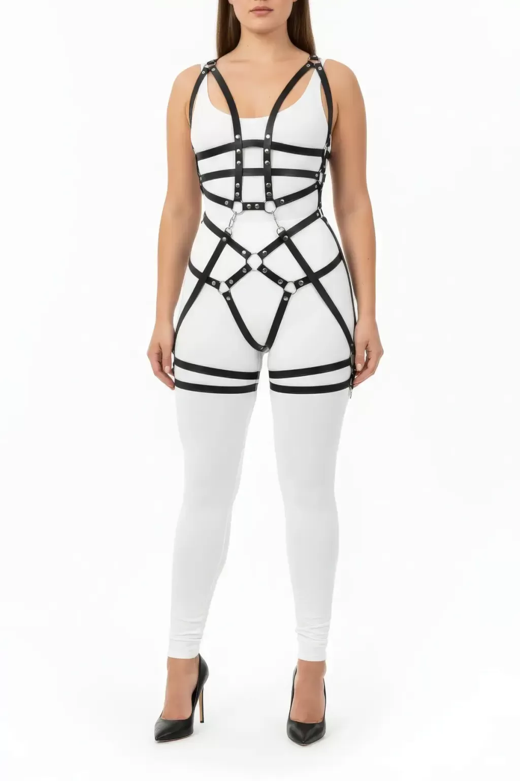 Büyük Beden Siyah Kadın Tüm Vücut Deri Harness Takım Halka Detaylı - APFT502