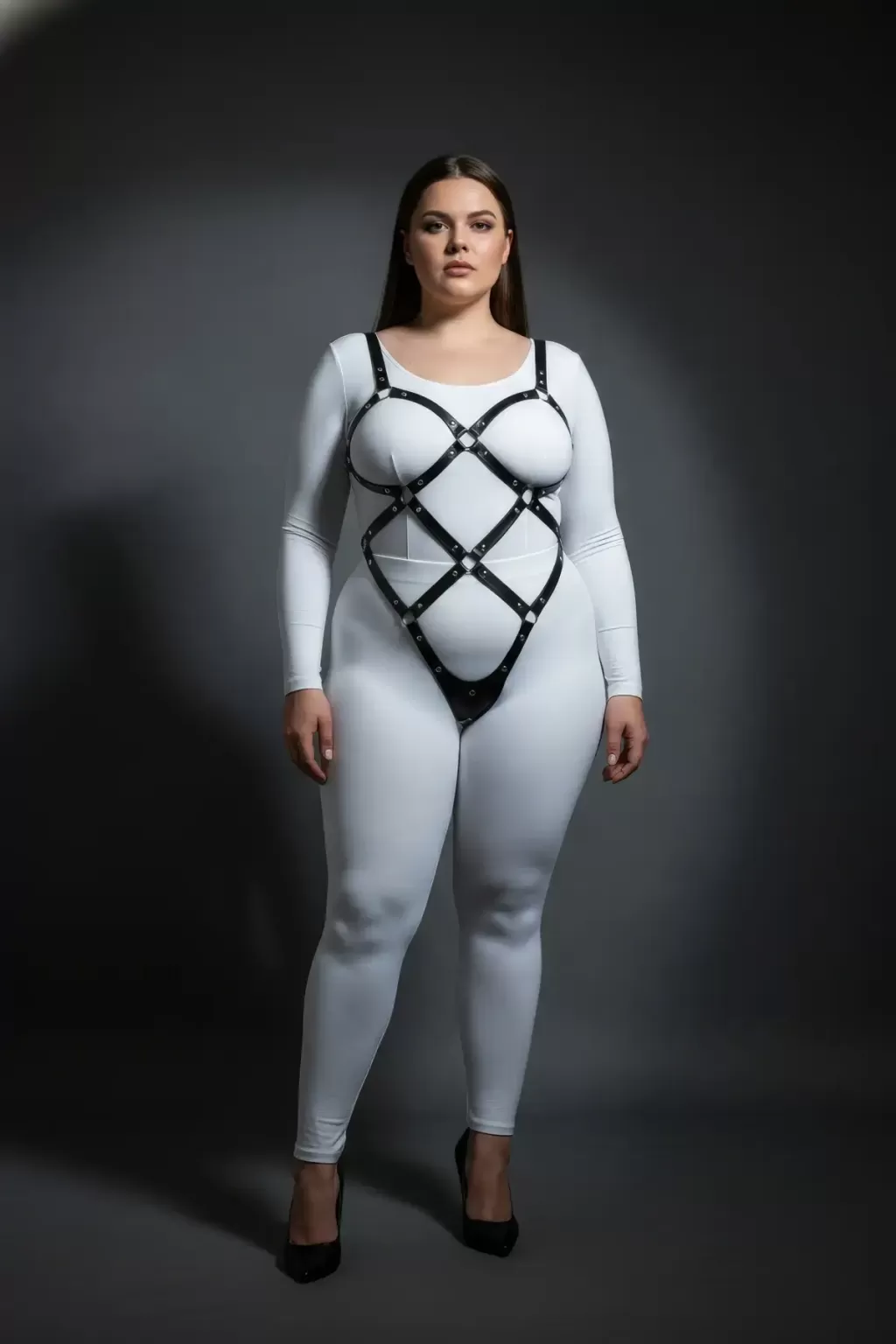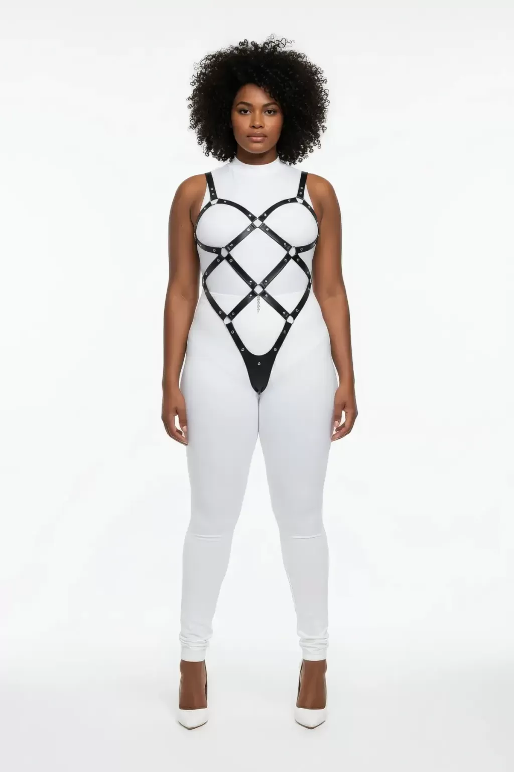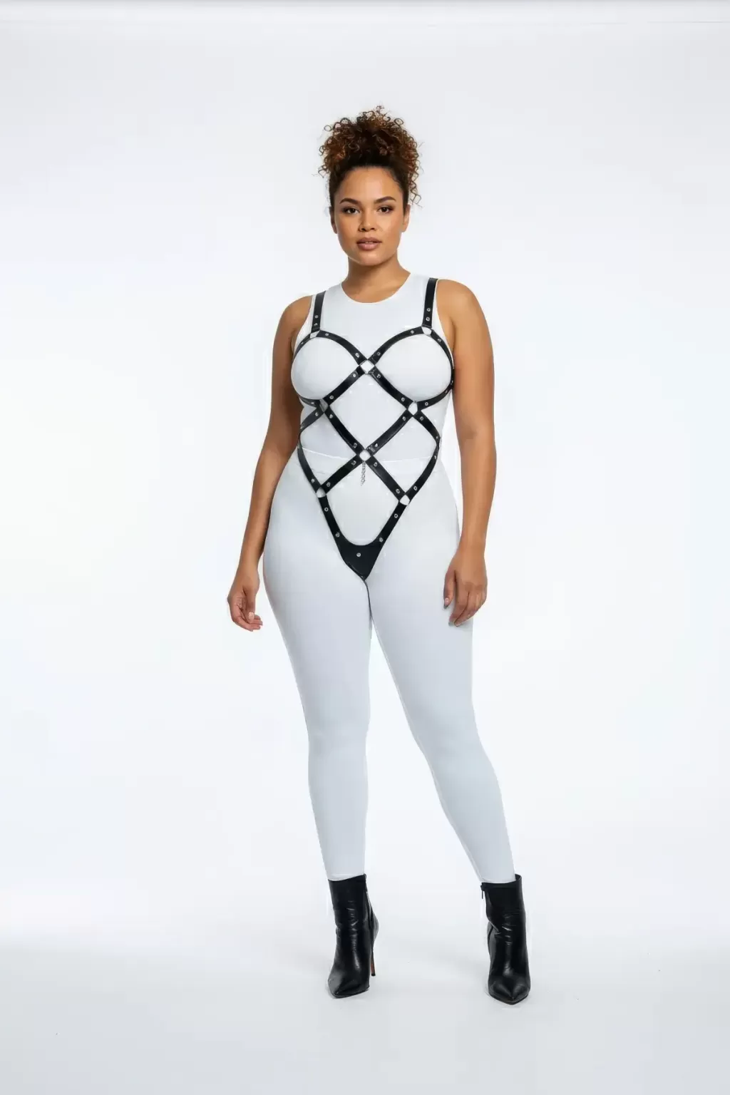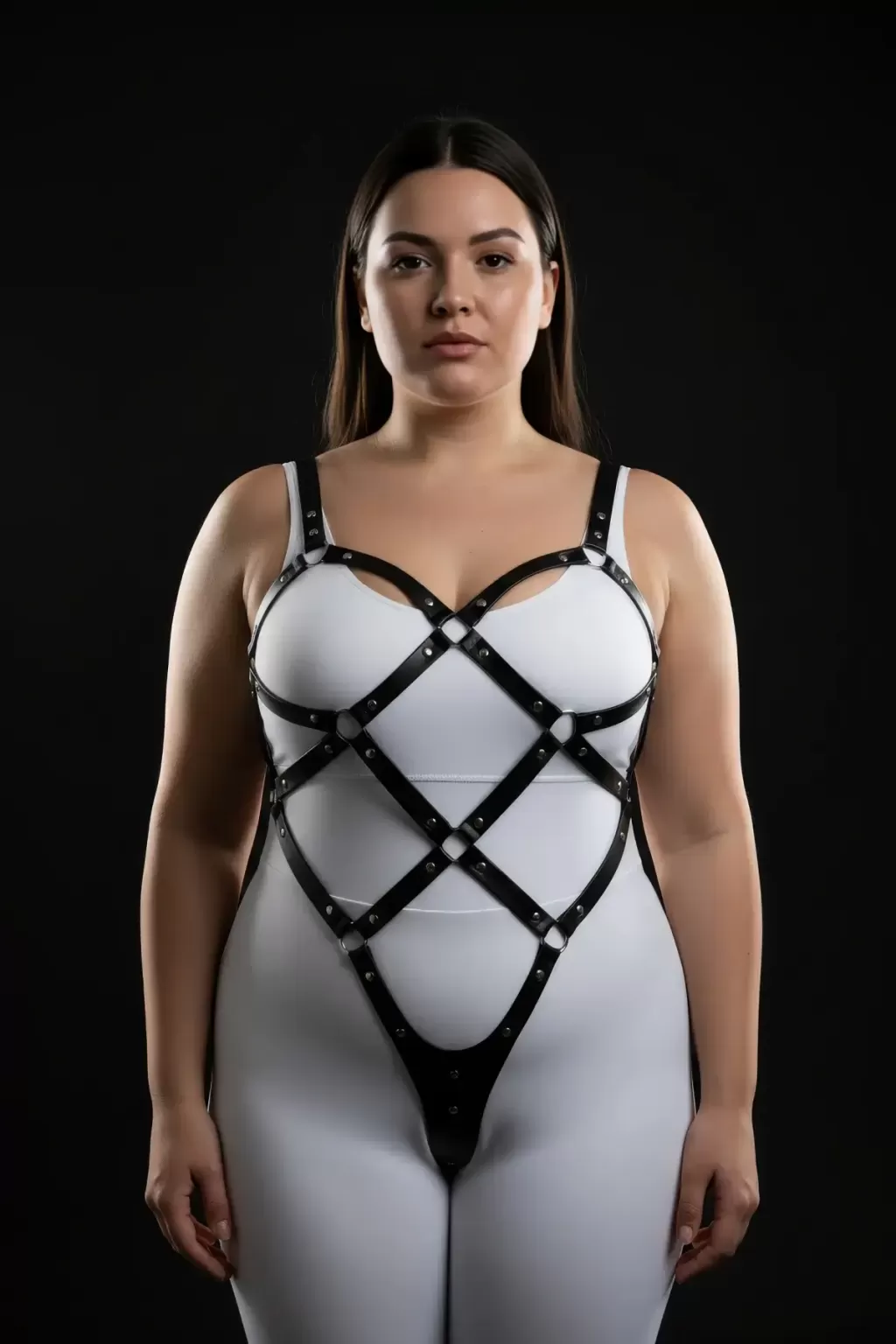 Büyük Beden Siyah Kadın Vücut Harness Takım, Çivi Detaylı Şık Fantazi Aksesuar - APFT542