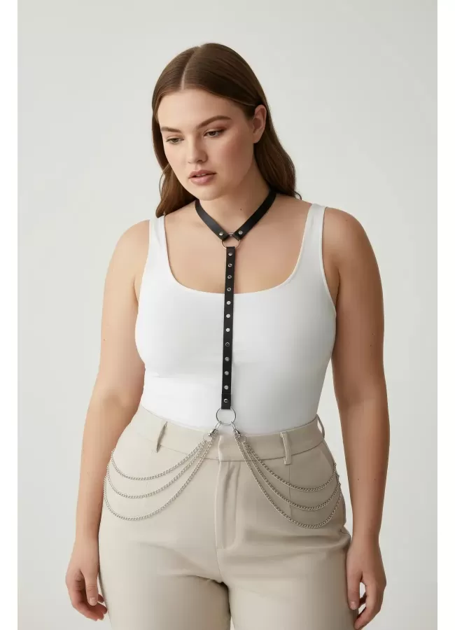 Büyük Beden Kırmızı Kadın Kemer Deri Harness Zincir Detaylı Vücut Aksesuarı - APFT9