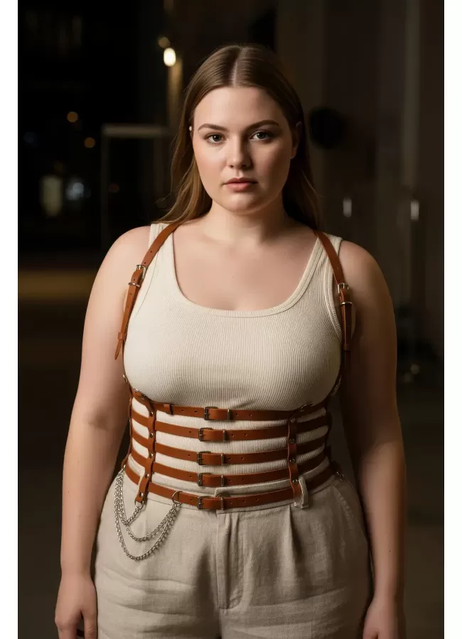 Büyük Beden Taba Kadın Kemer Zincir Detaylı Korse Tarzı Deri Harness - APFT626
