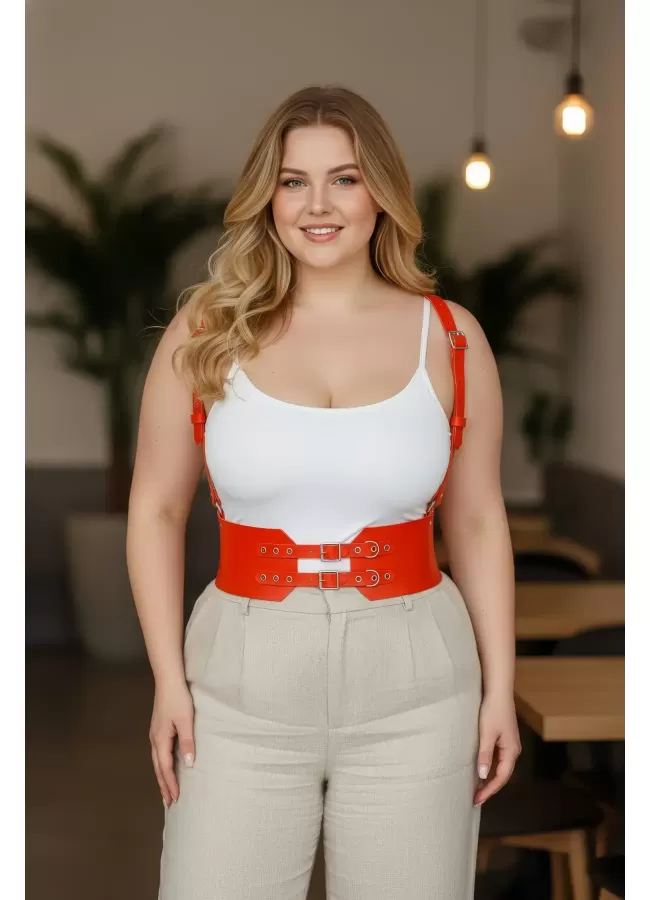 Büyük Beden Kırmızı Kadın Kemer Deri Harness Zincir Detaylı Vücut Aksesuarı - APFT9