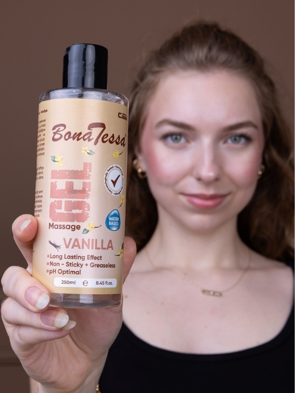 Uzun süreli kayganlaştırma özelliğine sahip, yüksek kaliteli ve ekonomik, pH derecesi optimal, vanilya kokusuna sahip su bazlı masaj jeli. Dermatolojik olarak test edilmiştir. Ilık suyla durulanmak suretiyle kolayca temizlenir. Kullanım : Özel kapağını açarak hafifçe sıkınız ve ürünü tüm vücudunuza yayınız.Daha fazla kullanmak istiyorsanız daha fazla sürünüz. İkazlar : Çocukların ulaşamayacağı serin ve kuru yerlerde muhafaza edin. Açıldıktan sonra 6 ay içerisinde tüketilmelidir. Kullanmadığınız zaman ambalajı kapalı tutun. Haricen kullanılır. Son kullanma tarihi ve parti numarası ambalajın üzerindedir.