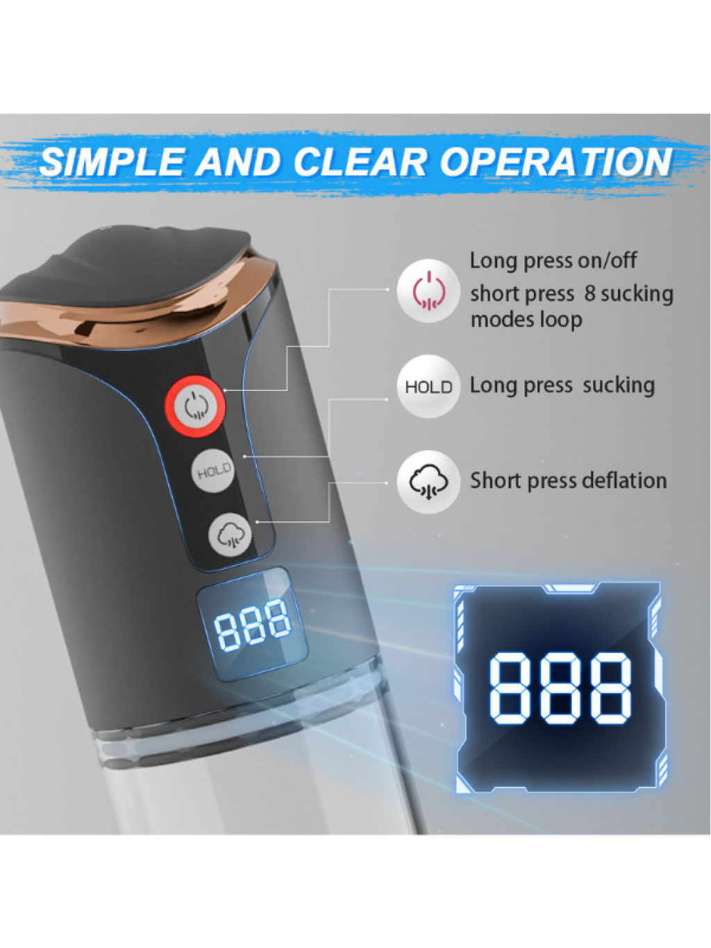 LCD ekranlı, yeni yükseltilmiş otomatik penis pompası, daha dayanıklı malzemeden üretilmiş vakum tüpü ve hava geçirmezliği artırılmış silikon kılıf ile geliştirilmiştir. Ayrıca, farklı uyarım seviyeleri sunmak için 6 farklı boyutta penis halkasıyla birlikte gelir. Tüm bu iyileştirmeler, penisinizin daha büyük, daha güçlü ve daha uzun süreli ereksiyonlara ulaşmasına yardımcı olmak için tasarlanmıştır.Penis pompası, negatif basınç yoluyla kan damarlarını genişleterek kan akışını artırır; bu sayede penis zamanla uzar ve sertleşir. Sonuç olarak, daha sıkı ve enerjik bir penis elde edilir. Bu süreç, psikolojik durumunuzu ve özgüveninizi de olumlu yönde etkileyebilir.LCD ekranlı güçlü emiş sistemi sayesinde kullanımı oldukça kolaydır. Kontrol ünitesinde üç düğme ile 8 farklı emiş modu ve sayaç modu bulunur. Dilediğiniz basınç seviyesini özgürce ayarlayabilirsiniz. Yeni başlayanların aşamalı bir şekilde kullanıma geçmeleri önerilir. Emniyet için, basıncı istediğiniz zaman serbest bırakabileceğiniz bir tahliye düğmesi de mevcuttur.Bu penis pompası, gizliliğinizi koruyan özel ve dikkat çekmeyen bir paket içerisinde sunulur. Paket içeriği: 1 adet penis pompası, 2 adet conta, 6 adet penis halkası, 1 adet manyetik şarj kablosu ve 1 adet kullanıcı kılavuzudur.