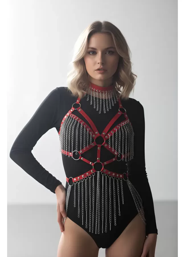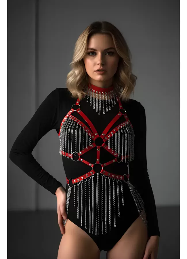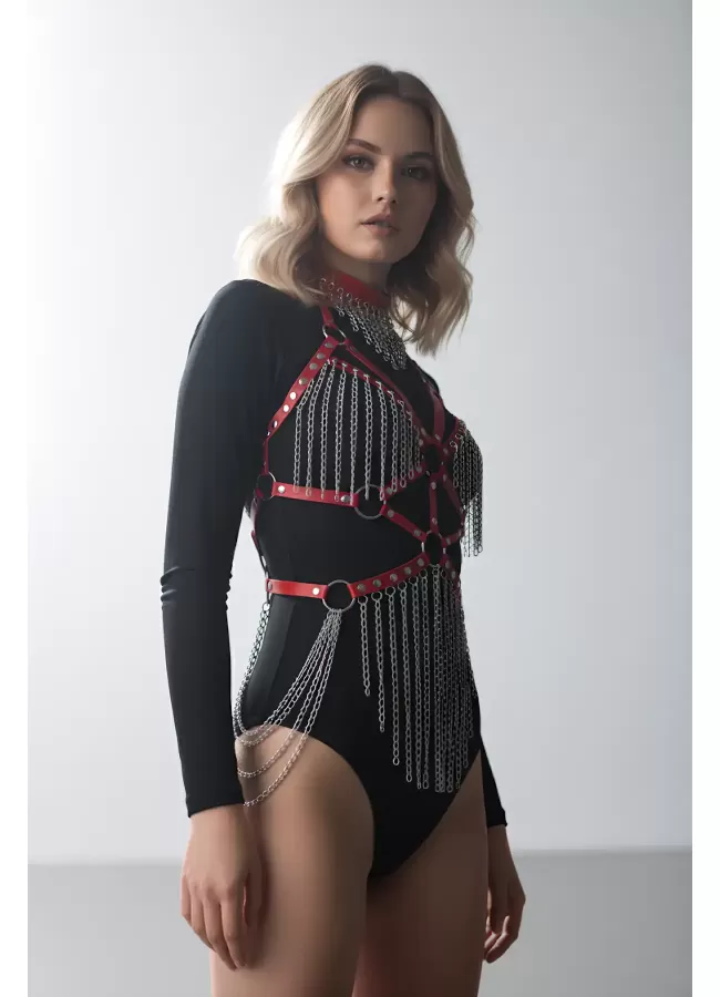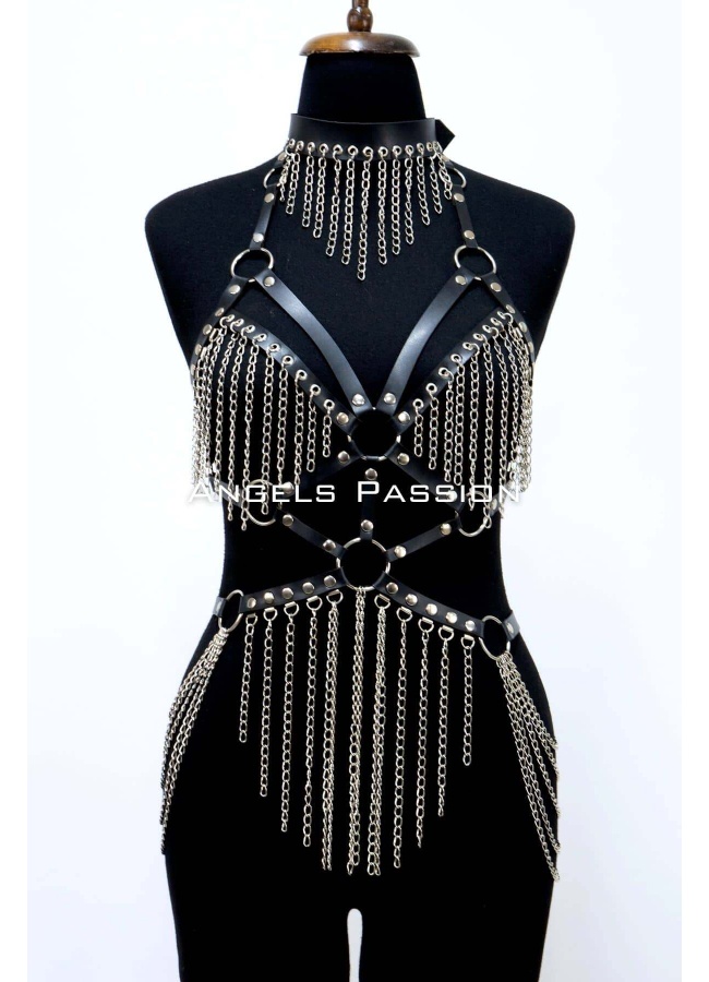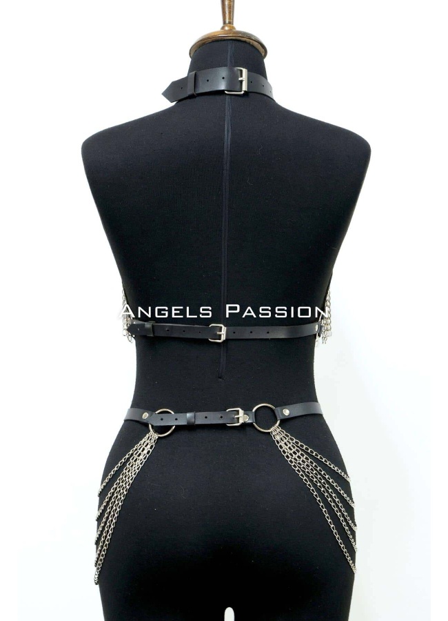 Deri ve Zincir Detaylı Harness Takım, Deri Dansçı Kostüm, Choker Detaylı Deri Harness - APFT1397