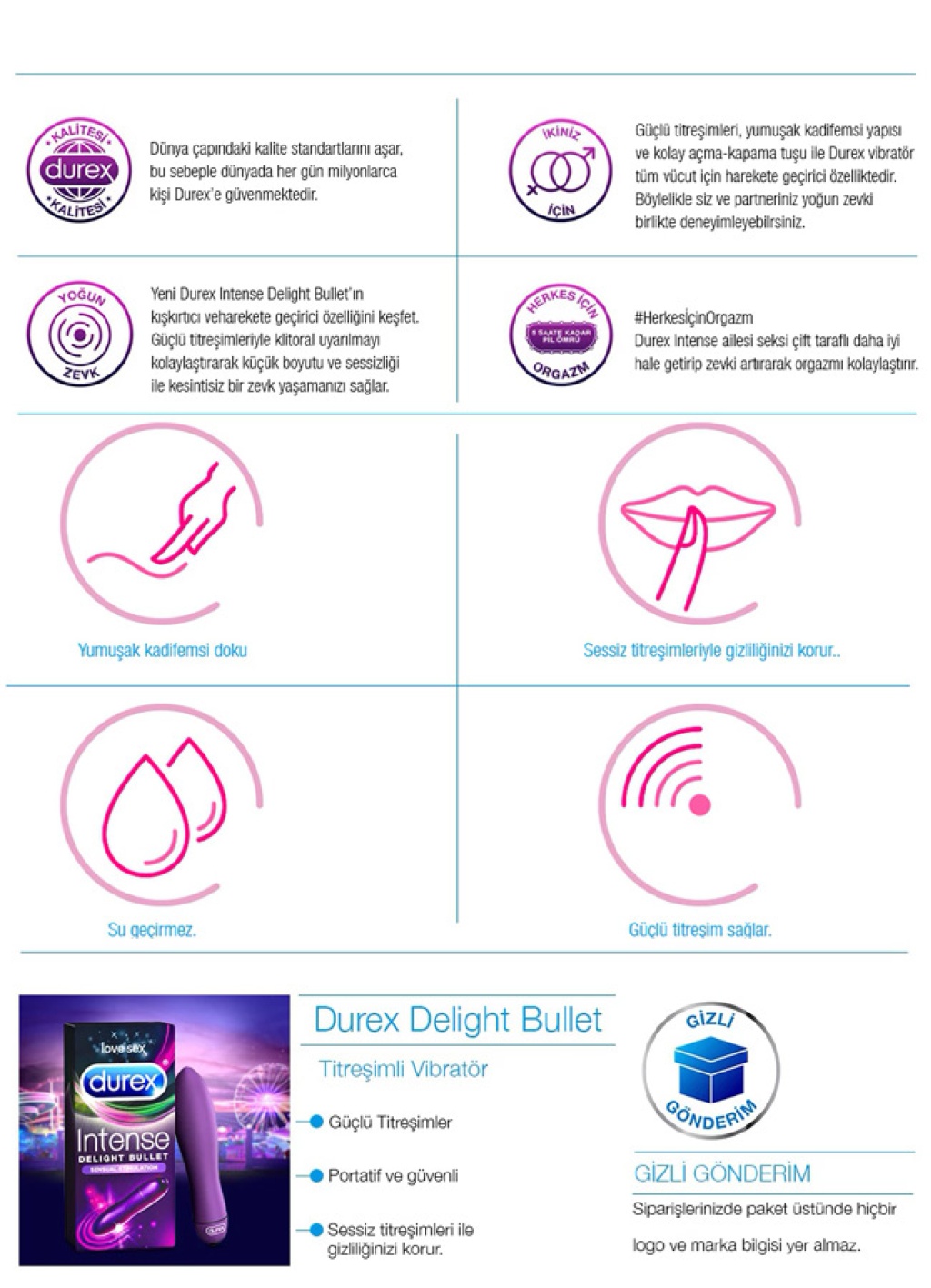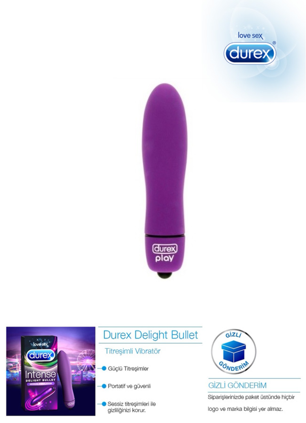 Durex Intense seks oyuncakları ile cinsel deneyiminizi çok daha zevkli hale getirin. Durex Intense Delight Bullet, seks ve ön sevişmeyi daha keyifli hale getiren titreşimli bir masaj aletidir.