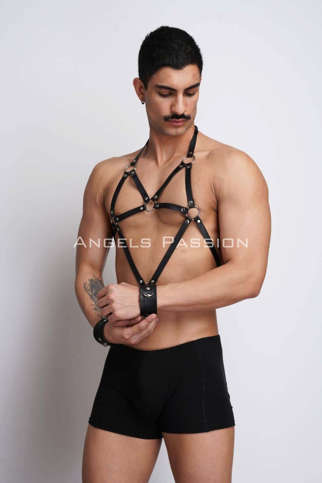 • Ürün ve paket içeriği: 3 parça (1 ad. Deri Göğüs Harness, 2 ad. Kelepçe)