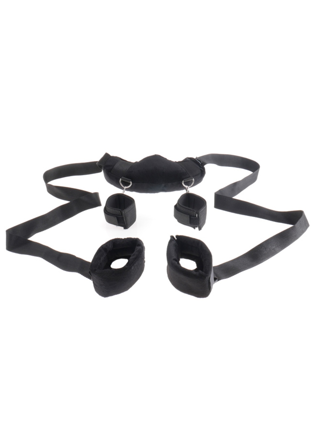 Lying belly-down on a bed or fully suspended from the rafters, this harness creates opportunities with full exposure. At the core of this set-up is a comfortable and padded adjustable collar. From there, two leads to ankle cuffs and two chains to wrist cuffs sprout off.