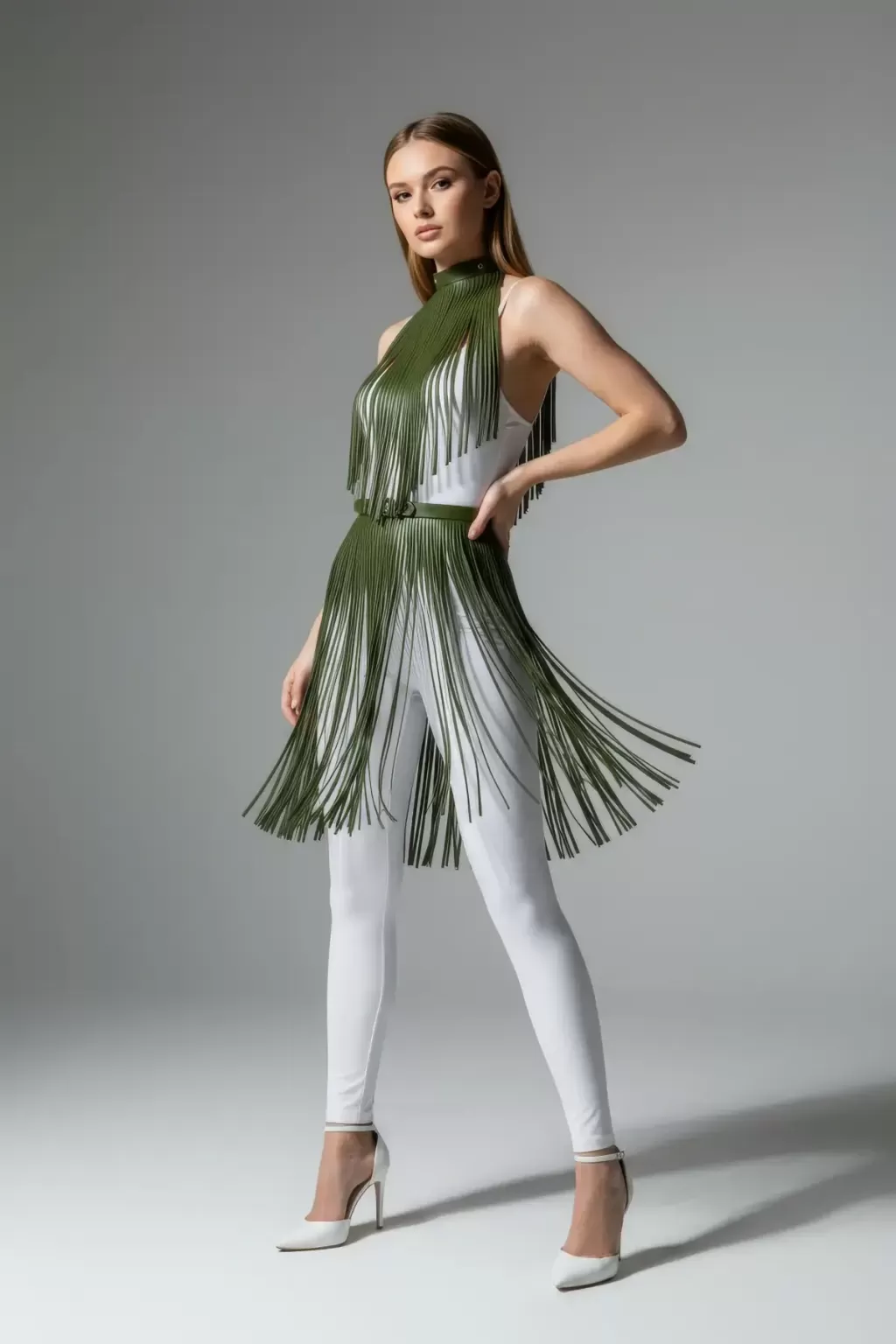Haki Etek Suni Deri Etek Püsküllü Parti Kıyafeti - APFT997