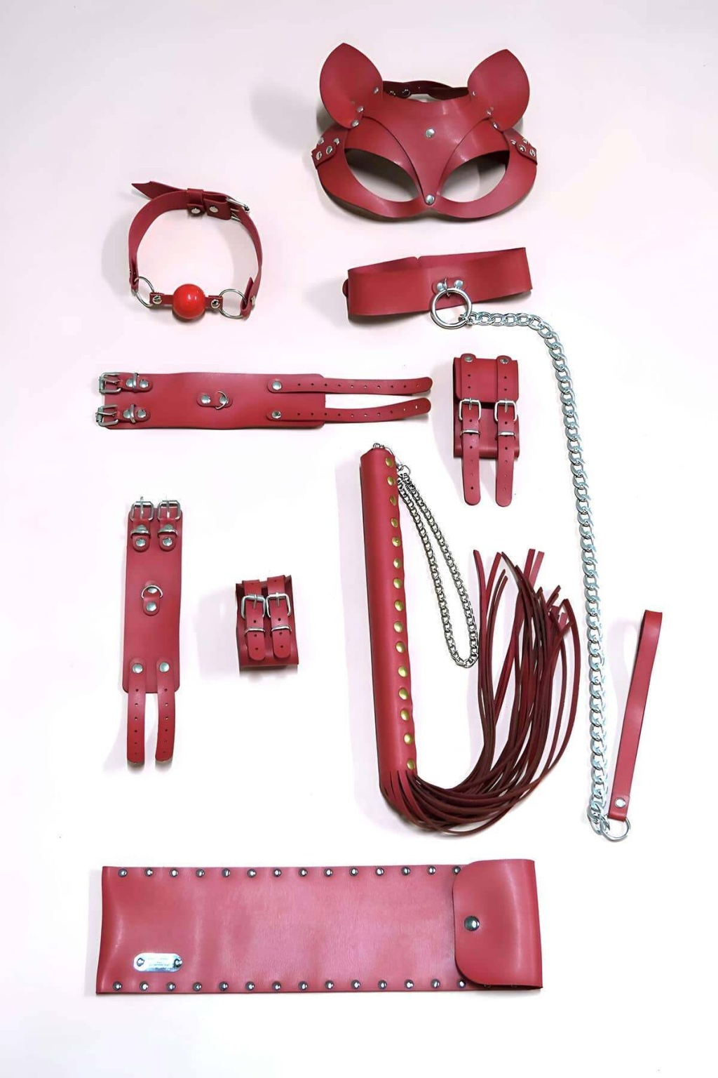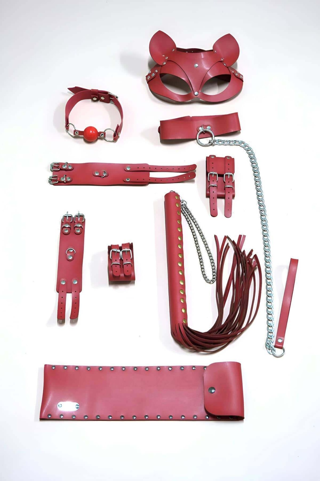 • Ürün ve paket içeriği: 6 parça (Kırbaç ve kırbaç kılıfı, el kelepçe takım, ayak kelepçe takım, tasma, ağız topu ve kedi maske )