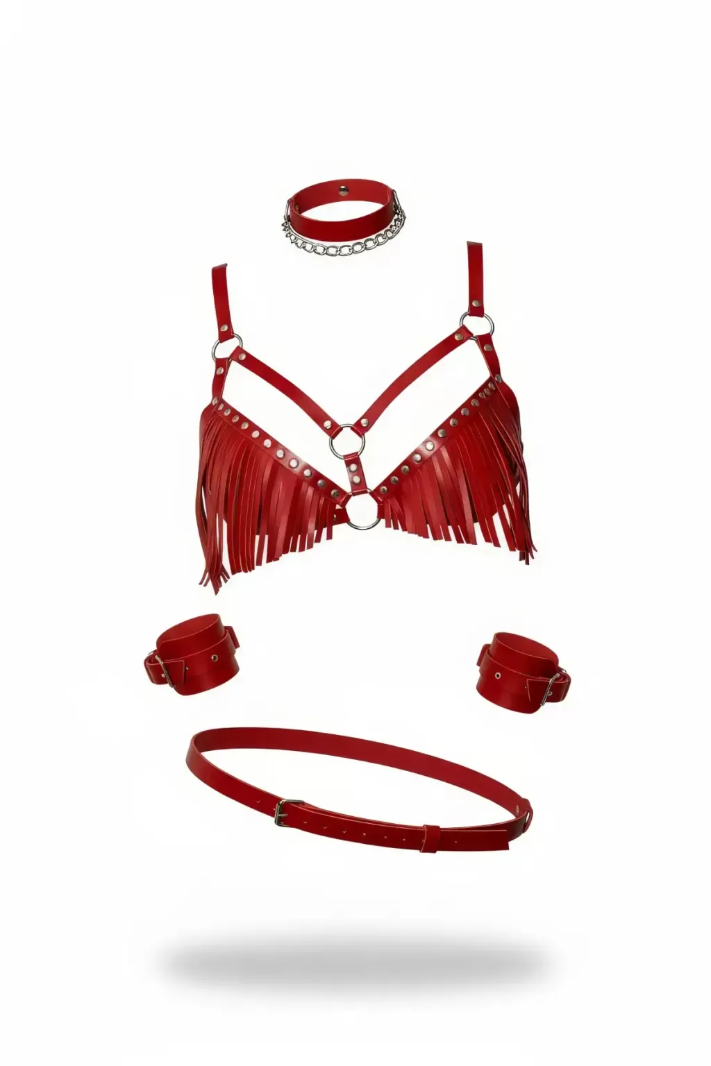 Kırmızı Tasarım Tasmalı Deri Jartiyer Takım