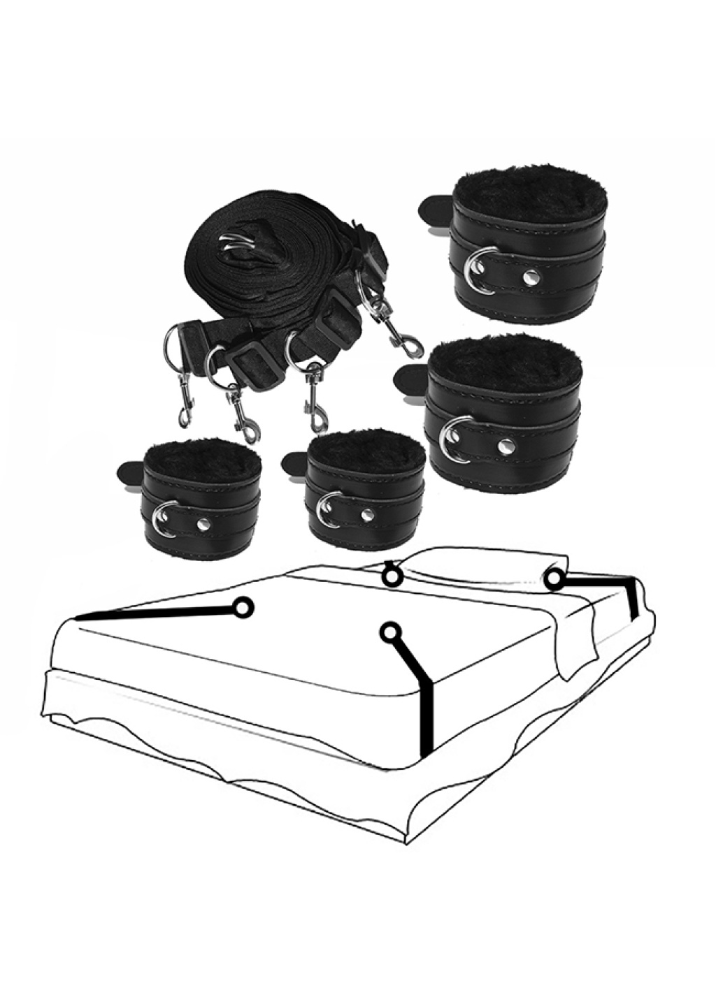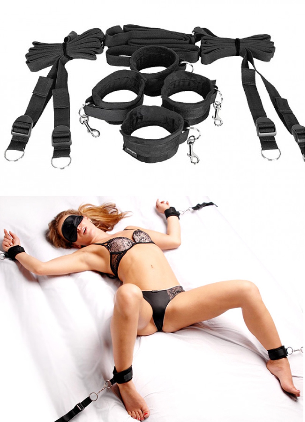 Sex Shop İstanbul Fetiş Fantezi serisine ait kelepçeli yatak bağlama seti, tekstil ürünlerinden üretilmiştir ve özel gecelerinize daha fazla renk katmak için tasarlanmıştır.