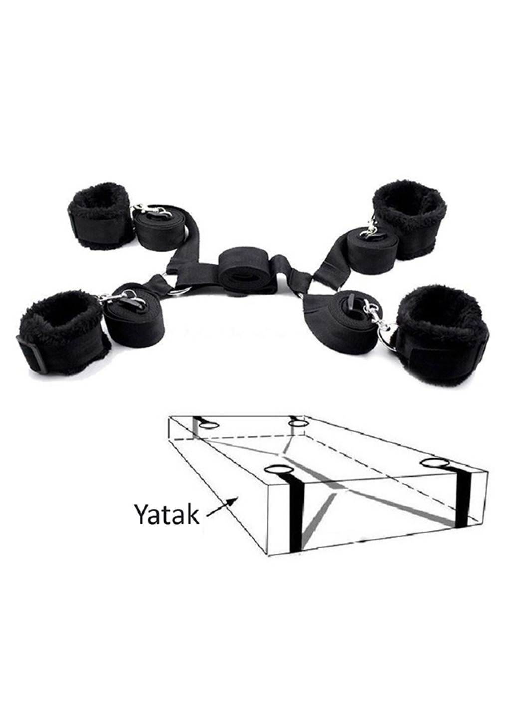 El ve ayak kısımlarını üstte kalan cırcırtları ile kelepçelerseniz partnerinizi yatağın üstünde çapraz bir şekilde sabitleyebilirsiniz.
