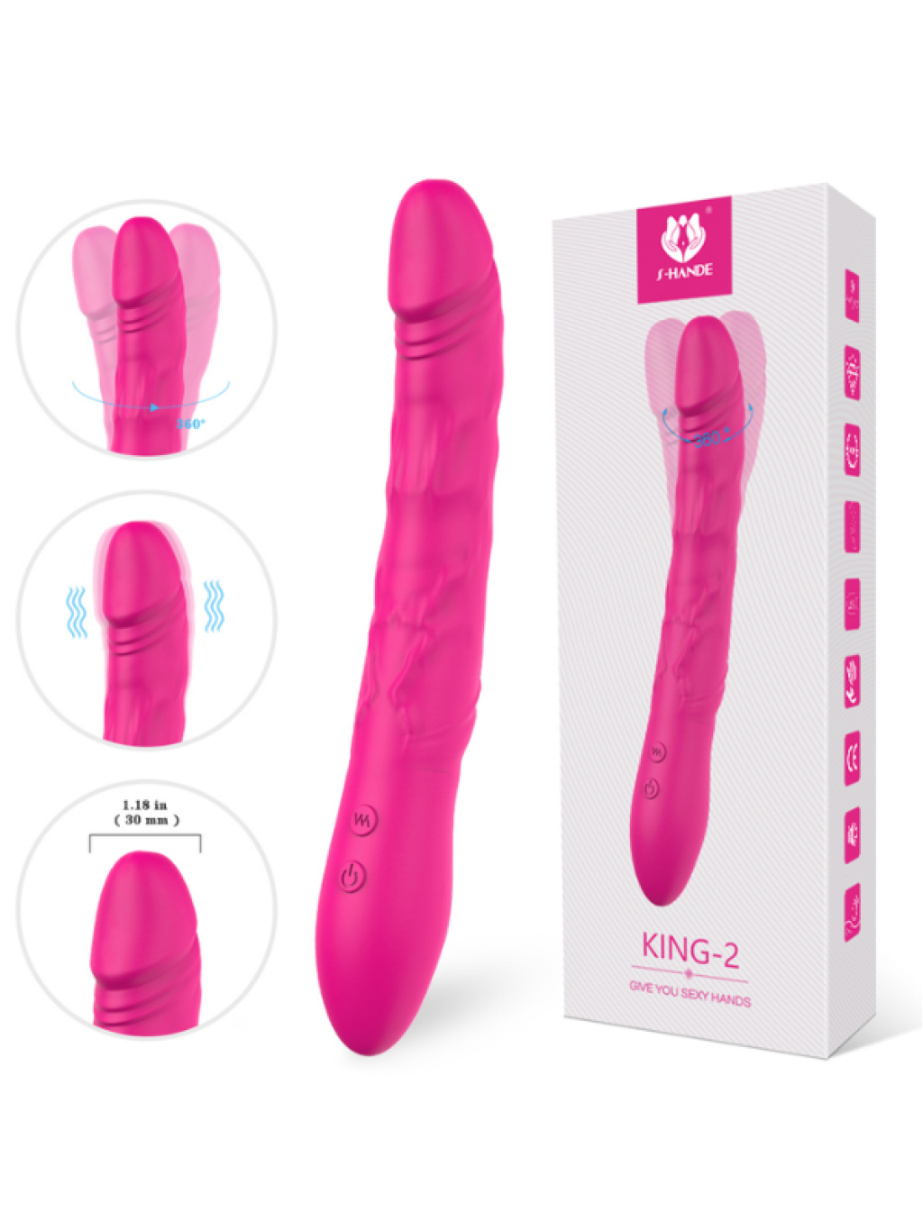 ÖzelliklerMalzeme Tıbbi silikonRenk MacentaGüç Şarj Edilebilir, 3.7V/600mAhAğırlık 165gBoyut 227mm*30mm*30mmFonksiyon 9 mod titreşim, 9 hız dönüşŞarj Süresi 3 saatÇalışma Süresi 2 saate kadarGürültü