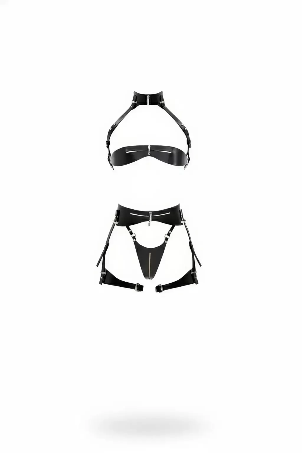 Siyah Jartiyer Harness Suni Deri Fermuar Detaylı Bralet Takım - APFT1373